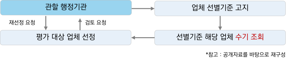 품질관리 인증 제도의 적용 범위가 지속적으로 확대되고 있으나 인증 업체의 관련 법규 위반 사례가 다수 발생하는 등 인증 제도에 대한 신뢰성이 저하되고 있습니다. 이에, 관리가 우수한 업체는 자체평가를, 주의관찰이 필요한 업체는 현장평가를 통해 차별화된 사후관리 체계를 마련하였으나 평가 대상 업체 선정 기준의 객관성 확보를 통한 효율적인 업무 프로세스 개선이 필요합니다. |