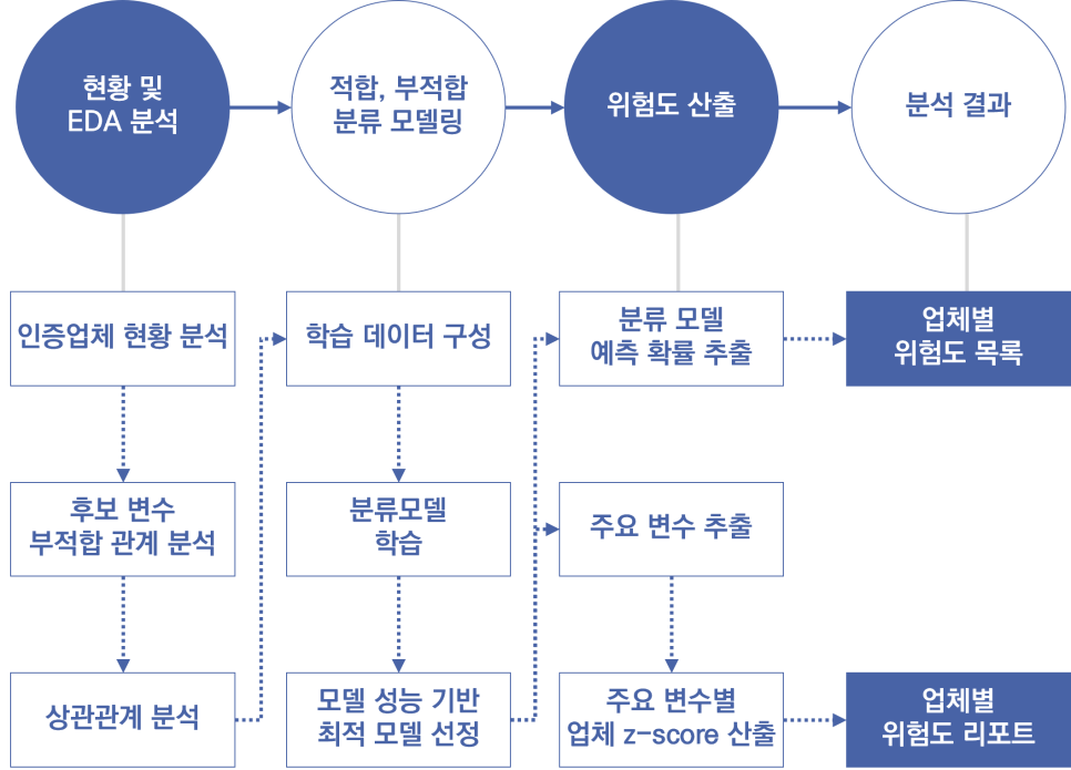 품질관리 인증업체에 대한 현황 분석을 통해 평가 결과에 영향을 미칠 수 있는 후보 변수를 탐색 및 발굴하고 EDA 분석, 상관관계 분석을 통해 발굴한 후보 변수들이 실제 평가결과(적합, 부적합)에 미치는 영향을 분석하고 평가결과를 분류하는 모델을 개발하여, 개발된 모델의 부적합 예측 확률을 위험도로 활용하여 업체별 부적합 위험도를 산출하여 현장평가 대상 우선순위를 선정할 수 있는 목록을 제공합니다.