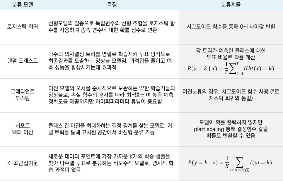 - 각 모델마다 확률 산출 방식은 다르지만, 모델이 학습한 데이터의 분포와 특성 공간에서의 관계를 기반으로 계산됨