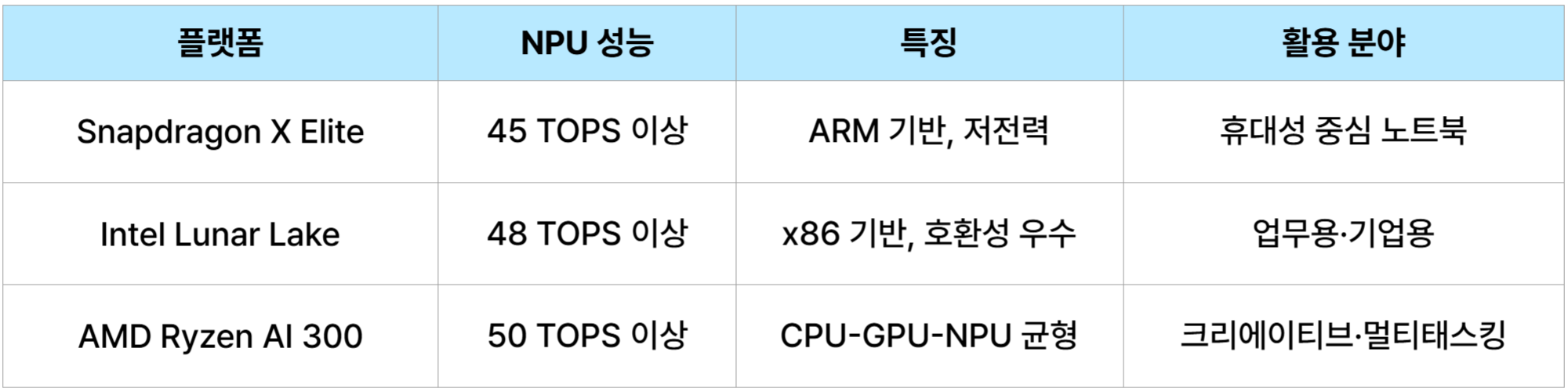 현재 시장에는 다양한 AI PC 플랫폼이 경쟁 중이며, 각각의 특성과 강점이 뚜렷합니다. 아래는 대표적인 세 가지 플랫폼의 비교입니다. |