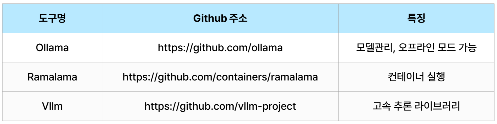 모델을 사용자와 연결하는 API 서버를 구성합니다. 이때 캐싱, 스트리밍, 비동기 처리 등을 고려합니다. 이러한 역할을 하는 도구들 역시 오픈소스로 제공되고 있으며 구축하고자 하는 요구사항과 상황에 맞게 선택하도록 합니다. |