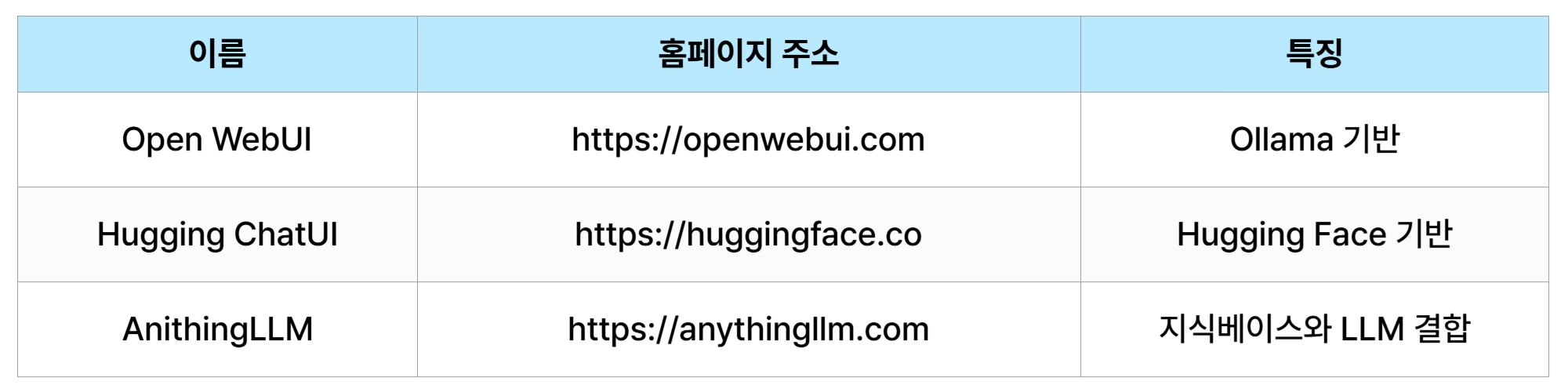 사용자 인터페이스(UI)를 연동합니다. 사용자 관리, 인증 등의 구성도 포함되어야 합니다. 주로 웹 환경에서 제공되는 오픈소스 UI 들이 존재하며 대부분 ChatGPT API 호출을 지원합니다. |