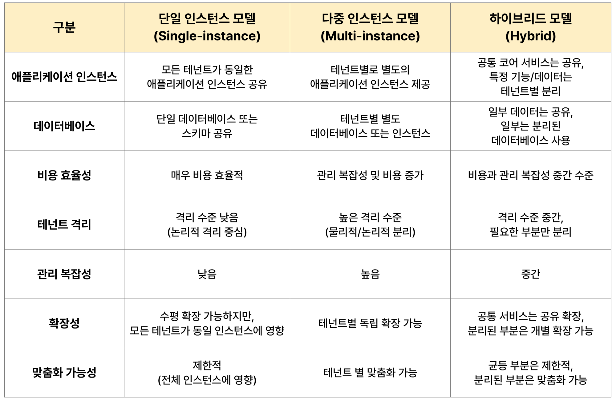 SaaS 아키텍처의 핵심은 '다중 테넌시(Multi-tenancy)'이며, 하나의 애플리케이션 인스턴스로 여러 고객(테넌트)을 동시에 지원하는 구조입니다. 성공적인 구현을 위해서는 이 구조에 대한 정확한 이해가 선행돼야 합니다. |